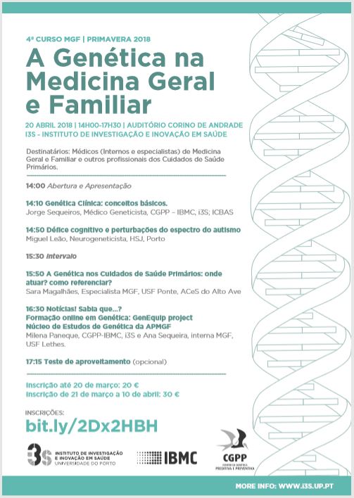 A convite da Equipa do Instituto de Biologia Molecular e Celular – Centro de Genética Preditiva e Preventiva do Porto (IBMC -CGPP), a Associação Portuguesa de Doentes de Huntington estará presente no Curso de Primavera 2018 “A Genética na Medicina Geral e Familiar”, que se irá realizar no próximo dia 20 de Abril, no i3S – Porto.